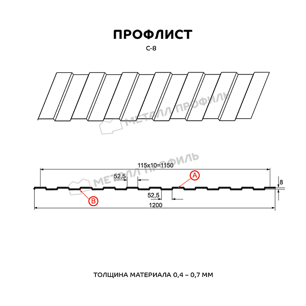 Профлист с наиболее маленькой трапецией. Его назначение – скорее дизайнерская функция, нежели несущая. С-8 убедительно справляется с такими задачами, как: возведение заборов, не подверженных серьёзным снеговым и ветровым нагрузкам, системы подвесных потолков, монтаж вентилируемых фасадов, внутренняя облицовка промышленных строений. Одинаковая с обеих сторон конфигурация профиля делает С-8 универсальным сырьём для разнообразных архитектурных замыслов. Оптимальная толщина металла – от 0,4 до 0,7 мм даёт возможность объектам из профлиста прекрасно справляться с любым своим назначением. А большая полезная ширина (1150 мм) помогает сэкономить на закупке профлистов. По вашему заказу мы можем изготовить листы металлопроката длиной от 0,5 до 12 метров.